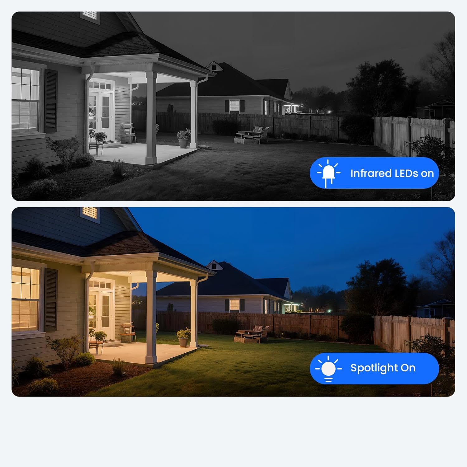 【DUAL NIGHT VISION | 2-WAY AUDIO & SIREN DETERRENCE】Equipped with 6 combined infrared and floodlight LEDs, the camera offers switchable IR night vision and color night vision for clear viewing in low-light environments. Enhanced 2-way audio allows real-time listening and communication, while the optional siren and floodlight help to deter unwanted activity around your property.